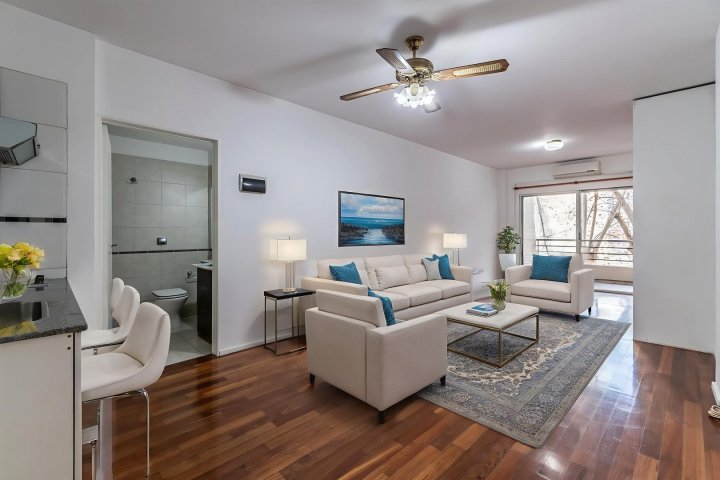Semipiso de tres ambientes al frente, orientación noroeste con salida a balcón corrido (con parrilla propia) y vista abierta. Ingreso principal por pasillo de distribución e ingreso a cocina integrada...